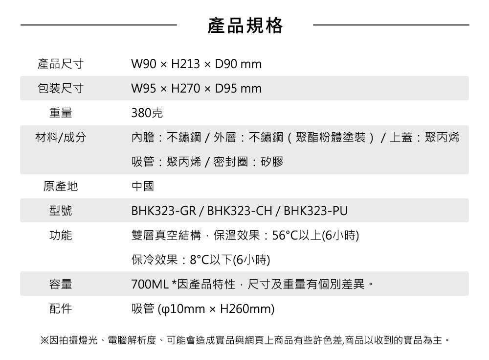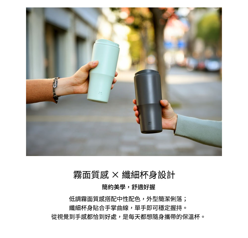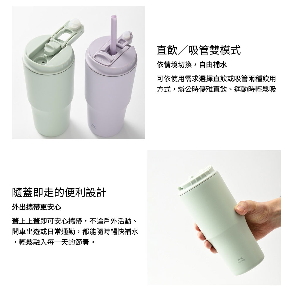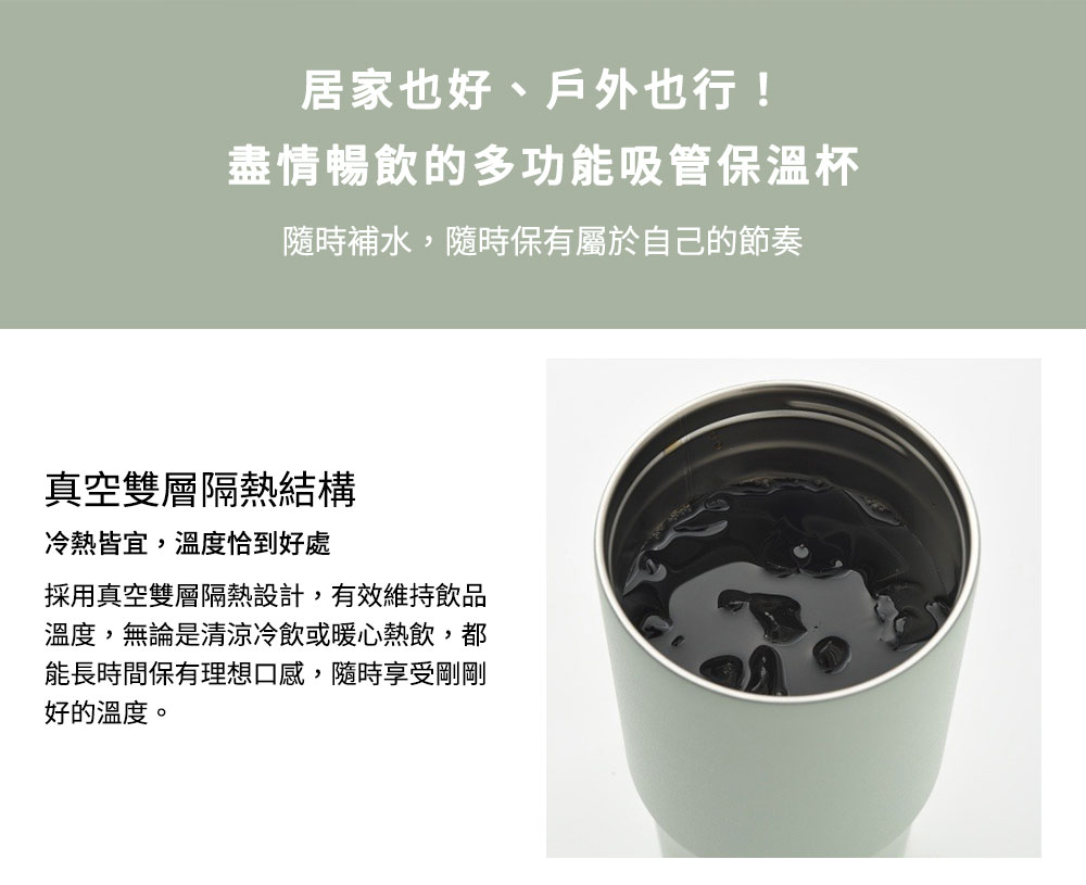 ‧ 真空雙層結構:有效隔熱,冷飲維持適溫更持久 ‧ 2WAY 飲用設計:可直飲或使用吸管,依使用情境自由切換 ‧ 蓋上即可攜帶:外出移動不必開蓋,戶外、開車都能安心使用 ‧ 多場景適用:露營、運動、通勤、旅遊,隨時暢快補水 ‧ 霧面質感外型:低調細緻,搭配中性配色更耐看 ‧ 纖細好握瓶身:單手也能輕鬆掌握,使用更舒適 ‧ 日常補水好夥伴:讓喝水變得更主動、更輕鬆的吸管隨行杯 ‧ 保溫效力:6 小時維持 56°C 以上 ‧ 保冷效力:6 小時維持 8°C 以下